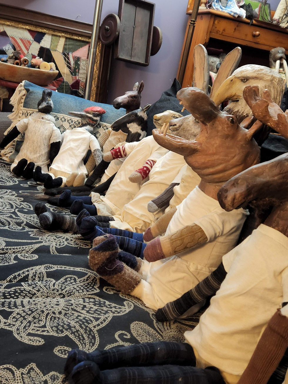 Each year as my annual menagerie progresses, I identify one or two themes running through their developing stories. These themes represent things I have had on my mind while carving, painting, and designing their clothing. My mind, like my mouth, likes to run, and while I am held captive by a menagerie trying to find its way out of the wood, my thoughts organize into a general idea.
